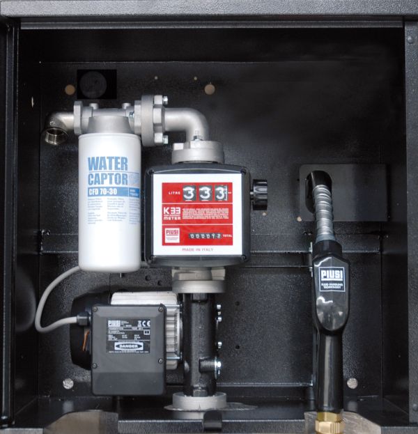 - Pompe à palettes 230 V auto-amorçante avec by-pass intégré - Convient pour l'extérieur et pour le gasoil - Débit 56 l/min - 2 m de câble électrique avec fiche murale - Niveau sonore inférieur à 70 dB - Compteur mécanique 3 chiffres avec molette de RAZ et totalisateur, précision +/- 1% - Filtre à eau et particules 30 µm - 6 m de flexible de distribution en caoutchouc DN 19, avec raccords filetés 1’’ et joints toriques - Pistolet automatique avec raccord tournant - Support pistolet automatique Livré complètement monté dans son armoire métallique en acier peint avec serrure à clé
